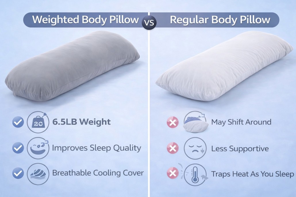 Una almohada corporal con peso puede mejorar la calidad del sueño al brindar soporte integral y una presión suave. Puede ayudar a reducir el estrés, relajar los músculos, favorecer una correcta alineación de la columna vertebral y crear una postura más cómoda para quienes duermen de lado.